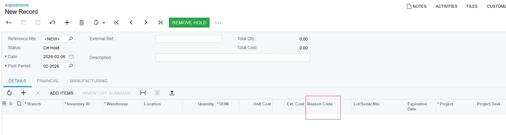 Note that when performing Inventory Adjustments, you should use the Reason Code with the appropriate adjustment account.