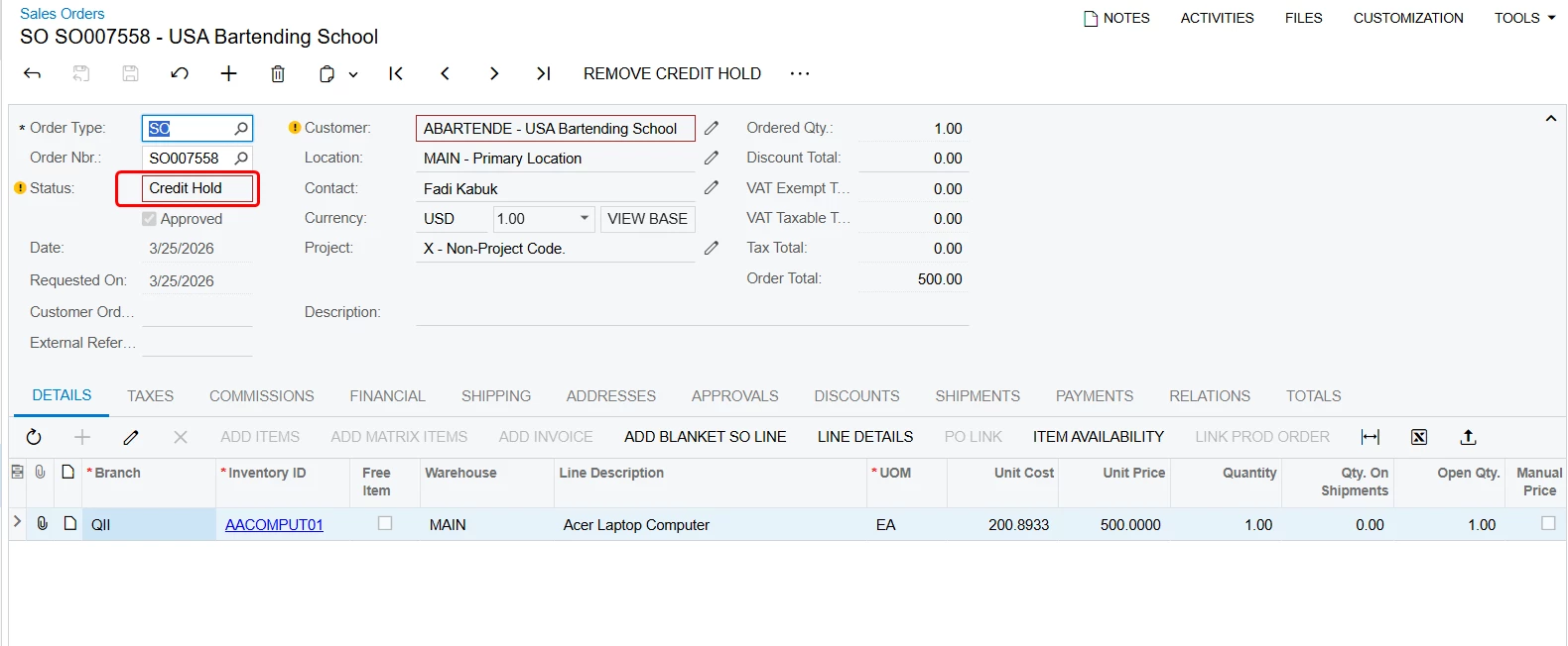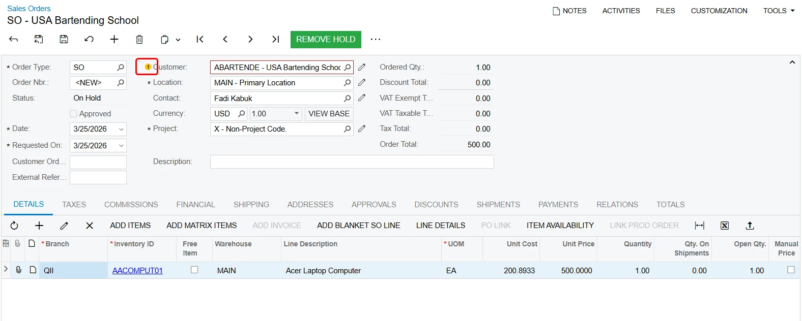 In Acumatica, when we create a Sales Orders with a customer exceeds in their credit limit. There’s a warning sign.