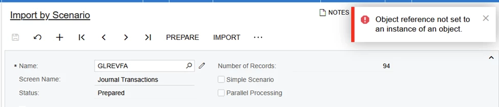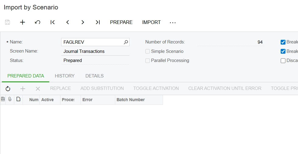 I have just created a simple Import Scenario (just batch numbers to be reversed) but when I Prepare the scenario, the results are blank.