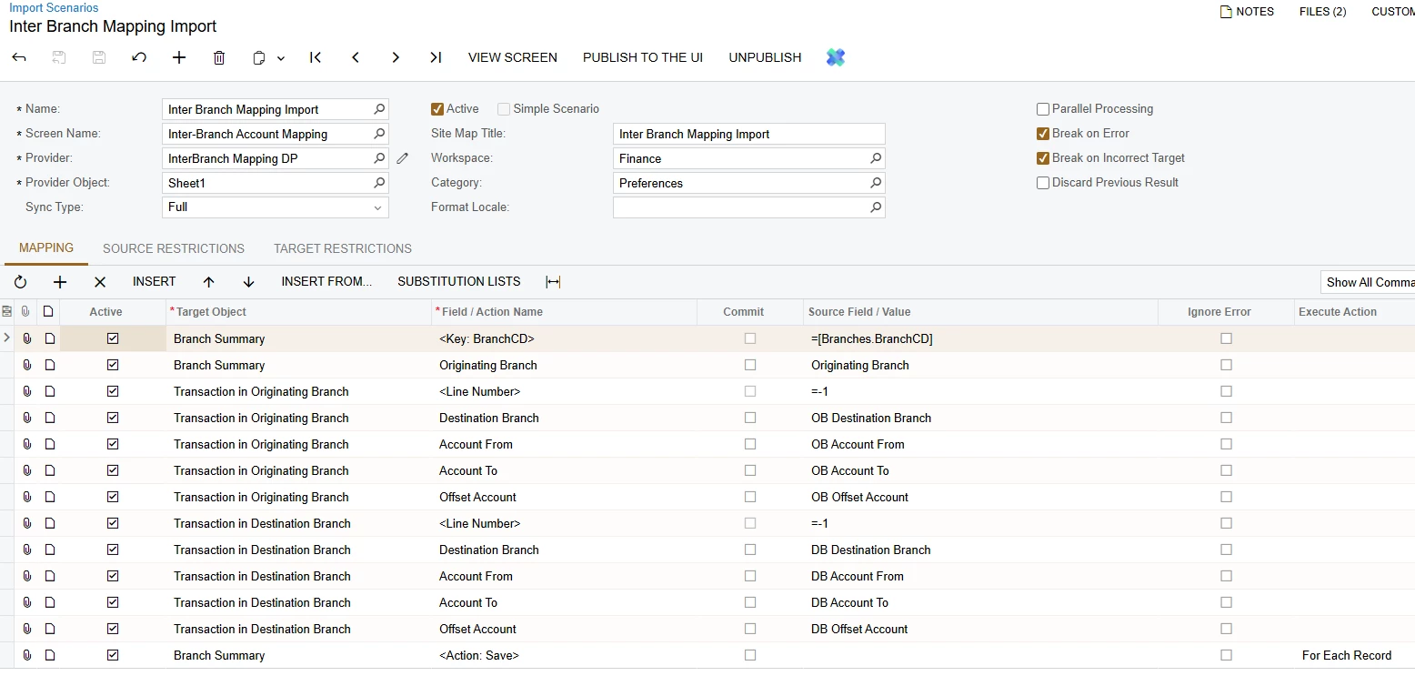 I created an import sceanrio that is working when the inter branch map does not exist in Acumatica. I am getting an error “The system failed to commit the MapFrom row.”, which is an update instead of inserting new records will show. I did play with the Commit for all of the items below, but not look.