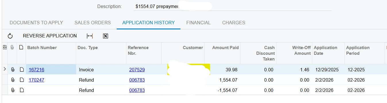 The initial payment (XXXX) and the refund (YYYY) both show as open in Acumatica.