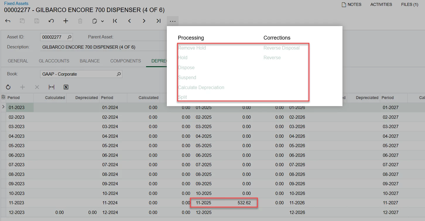 I did the tracking of the depreciation, and I verify that my client only calculates the depreciation of 11-2025 but without running the depreciation.
