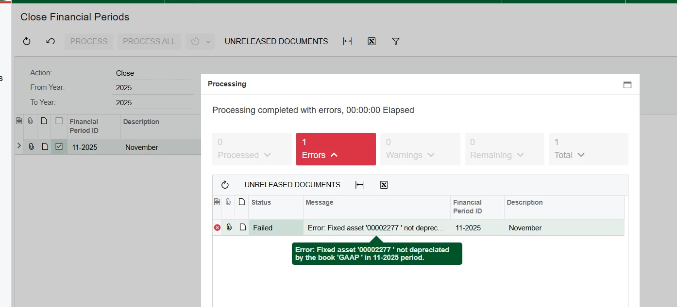 I have a FA that have been reversed on feb 2024, currently my client needs to Close 11-2025 period but he can’t, Acumatica show the following message: