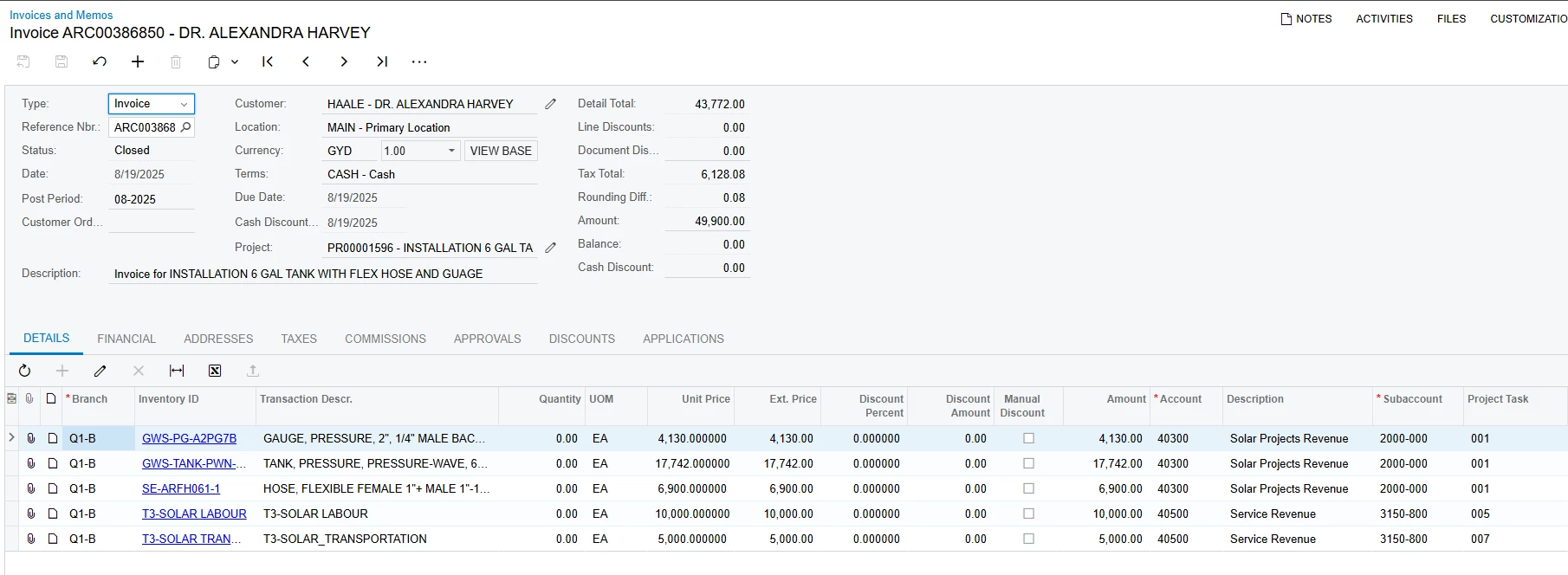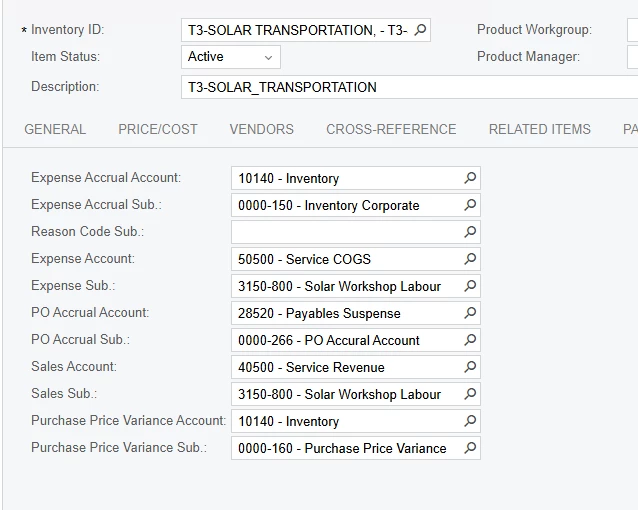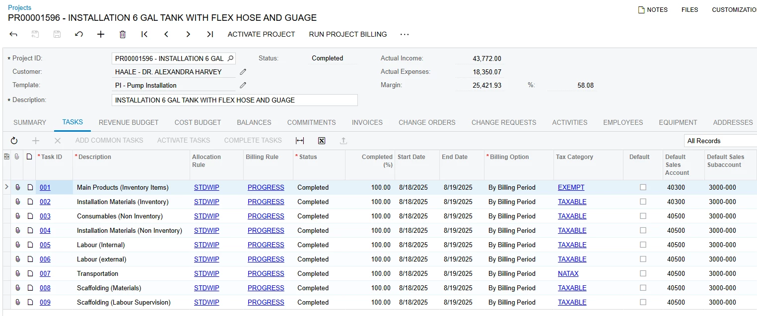 The Default Sales Account is 40300 (Solar Projects Revenue) and the Default Sales Subaccount is 3000-000 (Small Solar Installations - Products) these settings are correct and populated as such in the project.