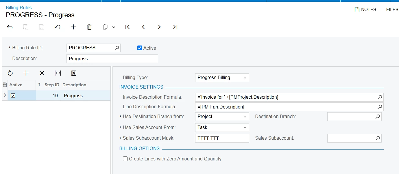 For our billing rule, we use 'Progress Billing' which is set up as: