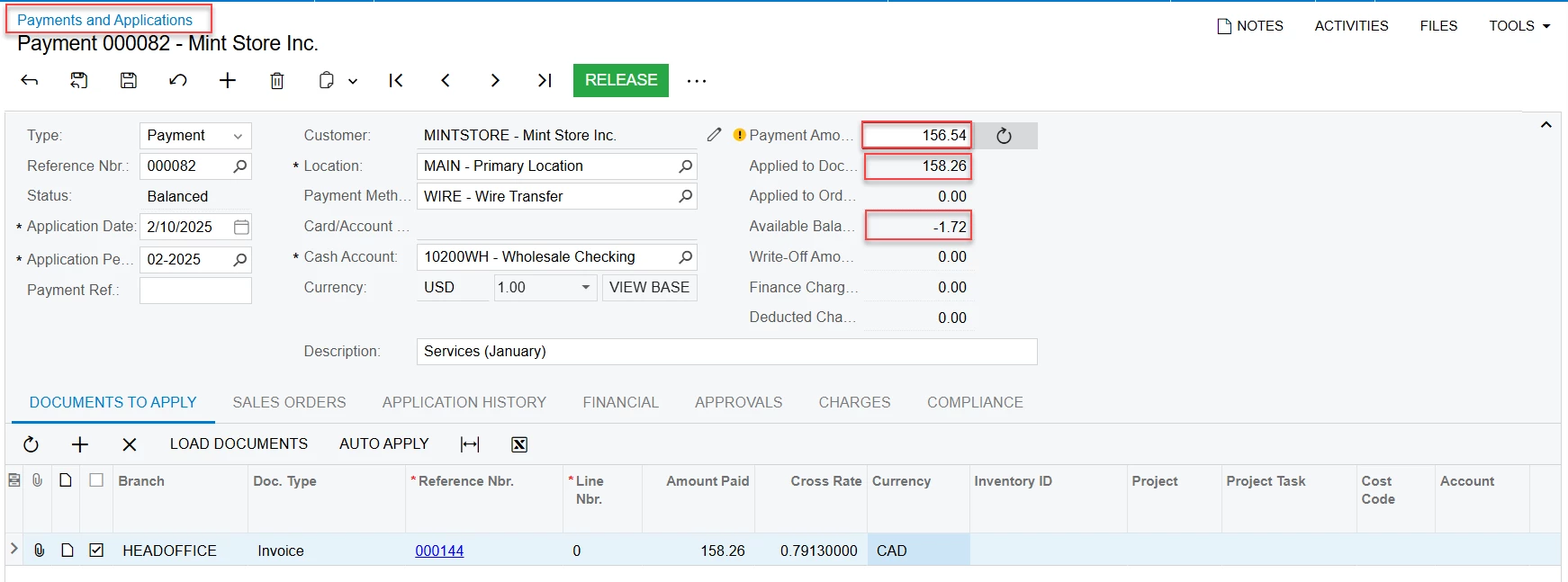 Edit the Invoice (If Allowed): Go to the invoice (000144). If it's now editable (depending on your Acumatica setup and the stage of the accounting period), you might be able to adjust the amount to $158.26.
