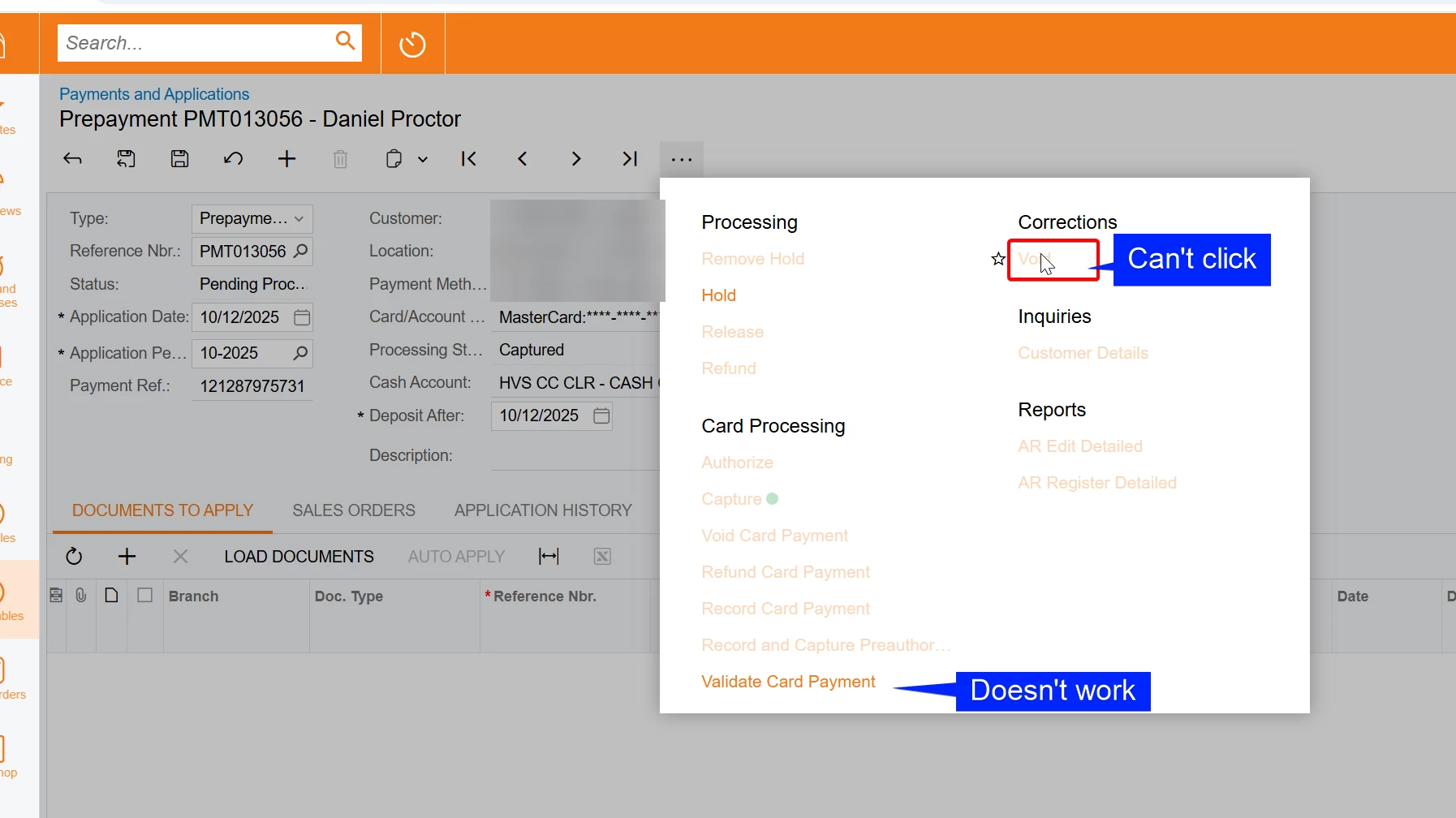 We have a few prepayments stuck in “Pending Processing.” They can’t be voided or validated.