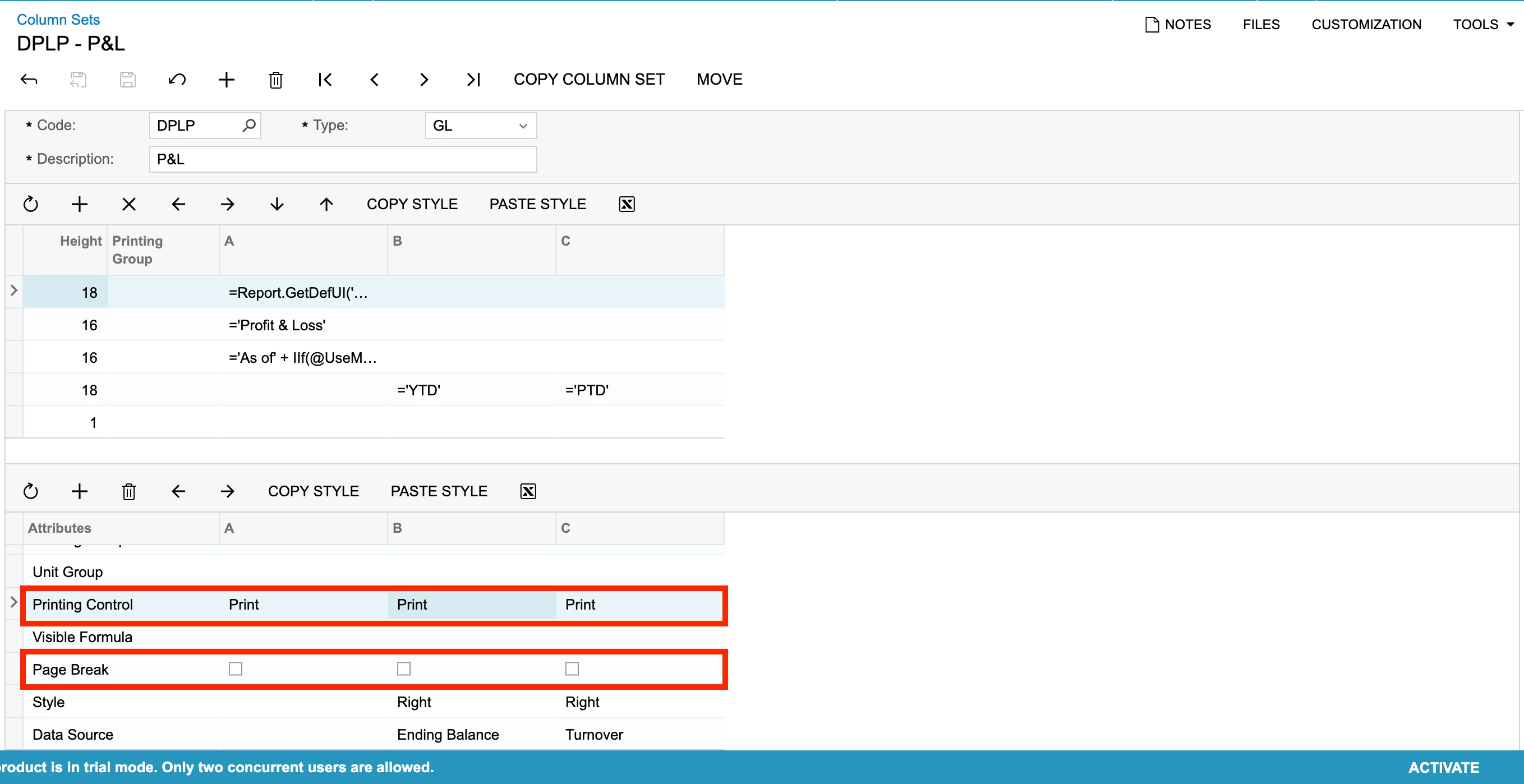 I have created a 12-Month Profit and Loss Report and I want the columns to print on each page of the report.
