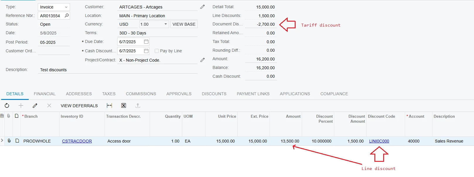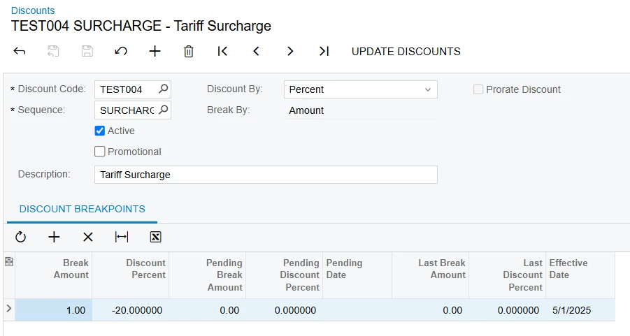 For the tariffs in Acumatica, we are looking at using a document discount (with the discount % being input as a negative). We are wanting the sales order line discounts to post to one GL account and the discount used for the tariff to post to different account. What is the proper way of setting this up in Acumatica?