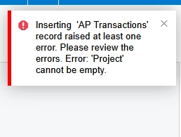 Sales Tax -Error -Inserting AP Trans actions record raised at lease one error. Please review the errors "Project cannot be empty