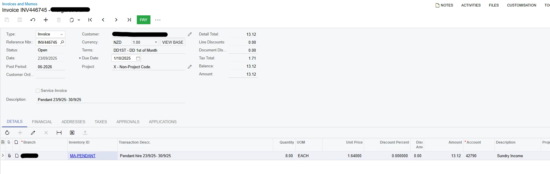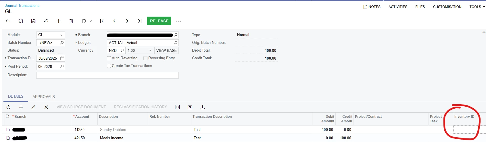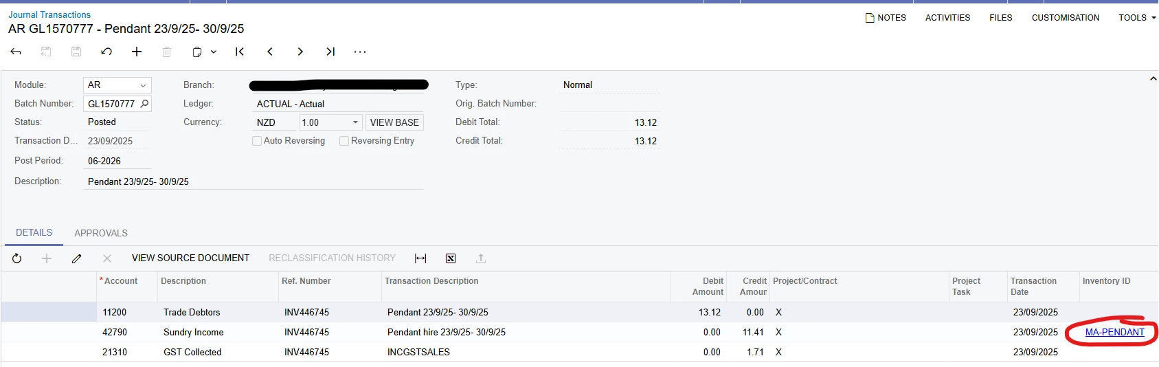 In contrast, the journals seem to be able to do this, below is a journal with a source document originating from the Receivables module, where the non stock item has been chosen on the invoice document.