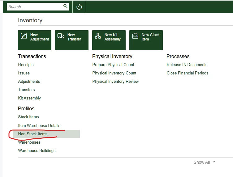 However, when I click into Inventory ID to select a stock item, the pop up only shows Stock items, which of course we don’t use/don’t have any.
