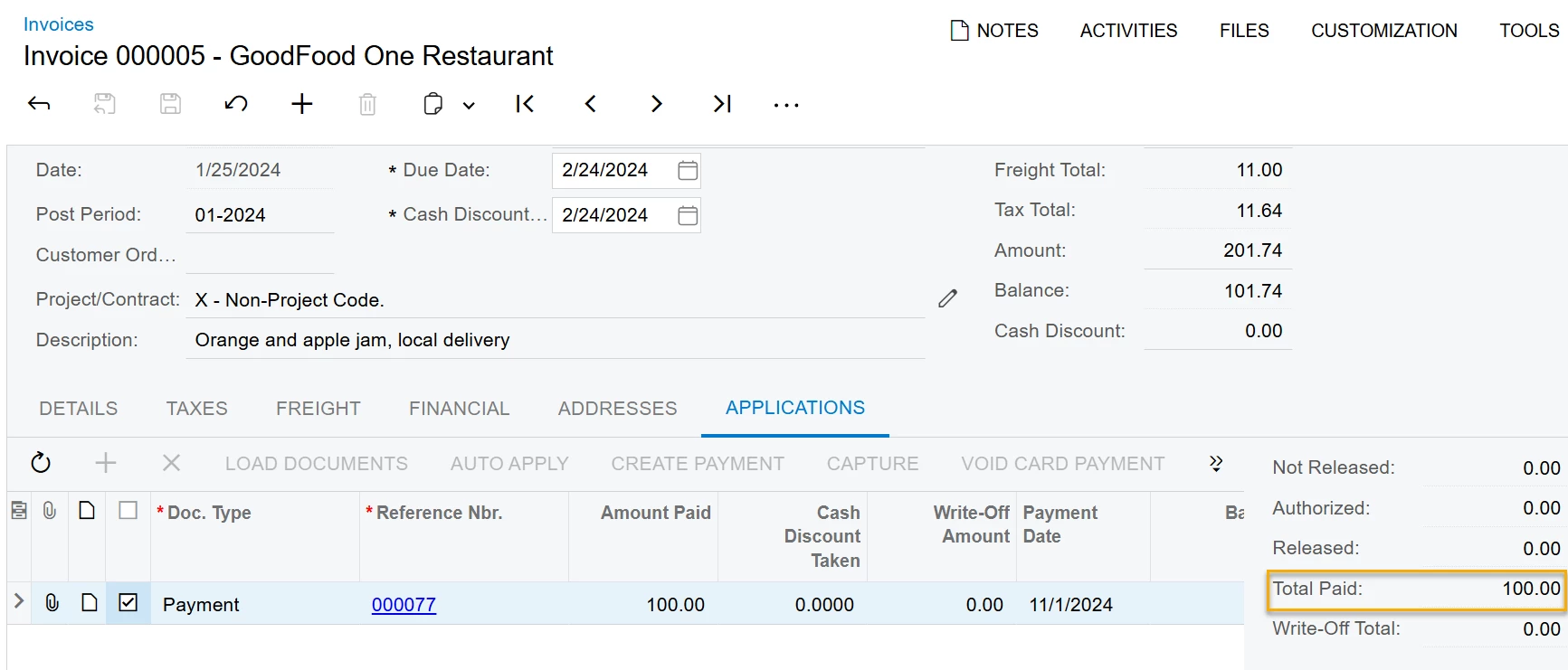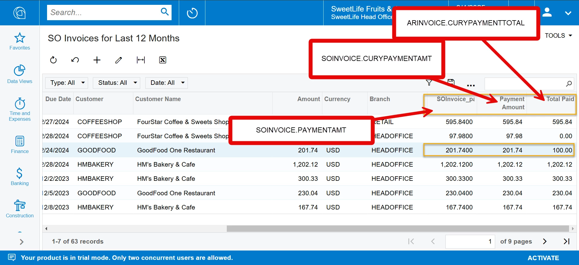 This is a general FYI. I have found that the SOInvoice.PaymentAmt field is calculating the total balance of the SO Invoice, rather than the Payment Total applied to the invoice. I created a scenario in my local environment shown below.