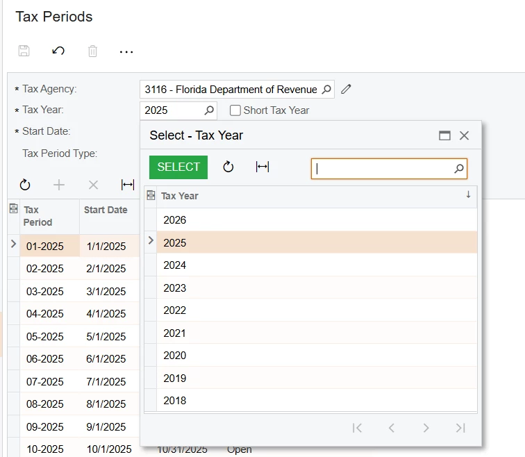 For example, for the Florida state tax Period, the system shows the years between 2018 and 2026