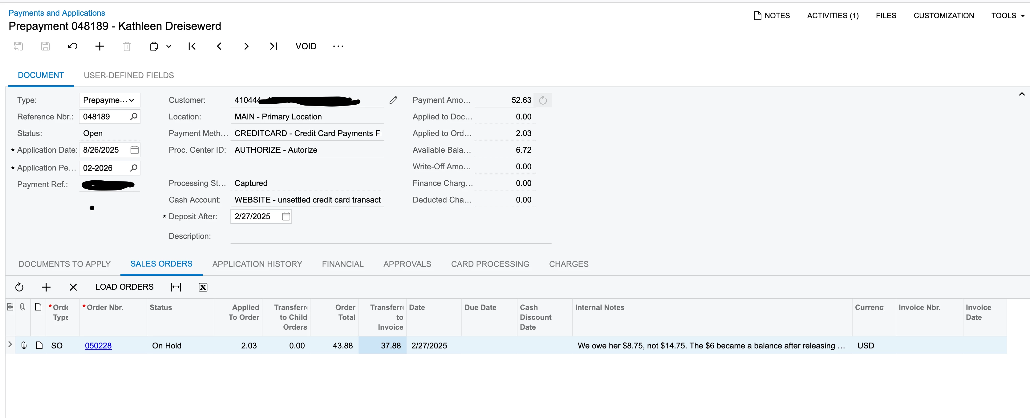 I have a prepayment that was applied to a SO. For some reason the correct amount of money was not transferred to an invoice, and I had to manually apply part of the prepayment to the invoice document. But now the “transferred to invoice” total does not equal the same amounts of all invoices (that are paid via that prepayment) Below are some screenshots