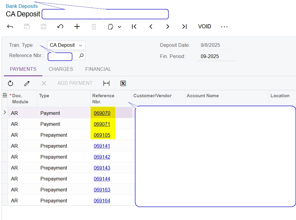 Are those payments the Batch Deposit check box selected? (Payment and application > Financial tab).