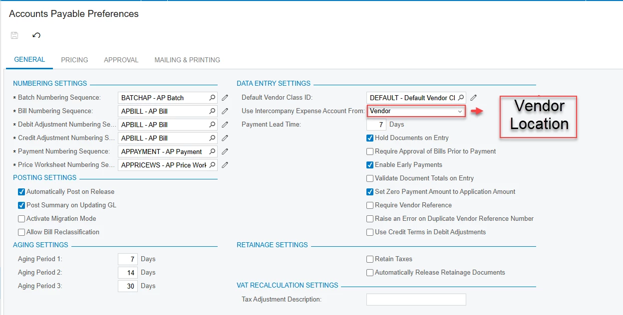 I am currently working through Lesson 3.1: Setting Up Intercompany Sales from the F300 Intercompany Transactions (2025 R1) course. According to the training materials, when configuring Accounts Payable Preferences, I should be able to select "Vendor Location" in the Use Intercompany Expense Account From field.