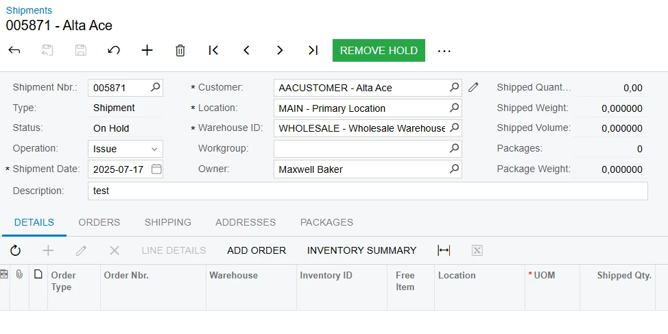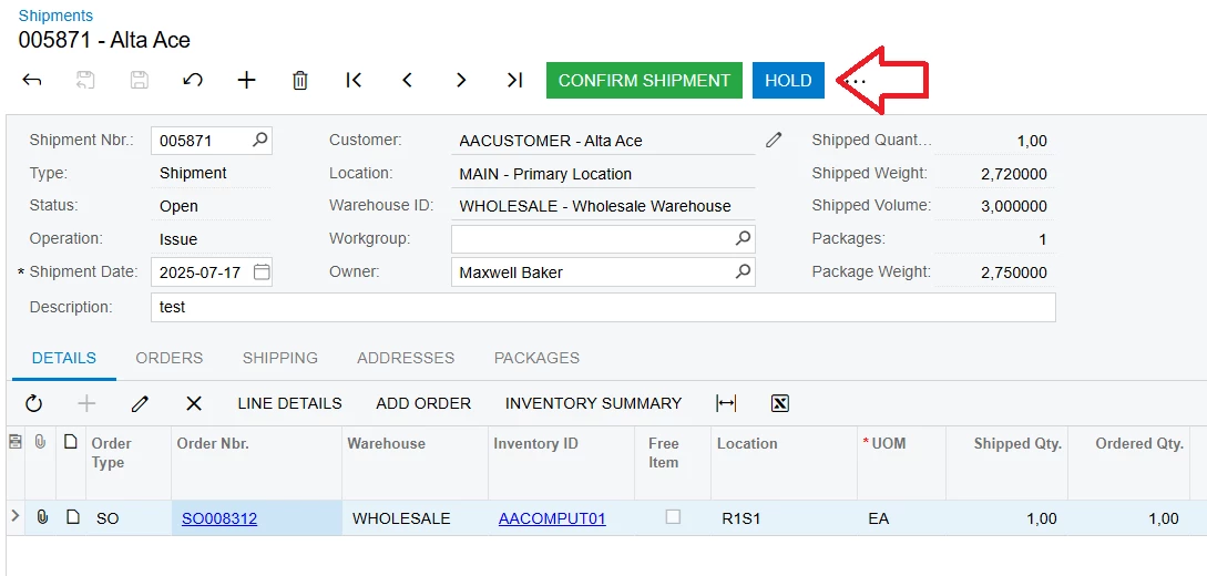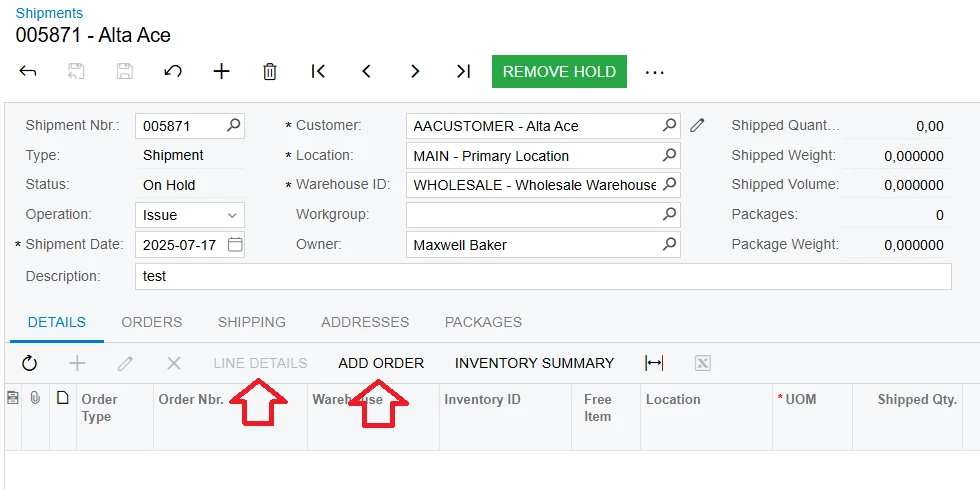 Then open Shipment again > Press "LINE DETAILS" or "ADD ORDER" to add to Sales Order after correcting the warehouse.