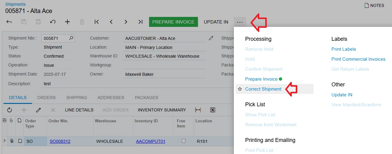 If Shipment has not performed "PREPARE INVOICE" > Open Shipment > Correct Shipment.