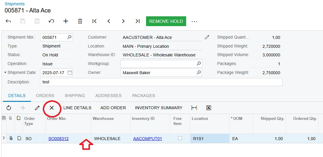 At Shipment screen > Press "HOLD" > Select the wrong line and press "X" to delete > Press SAVE