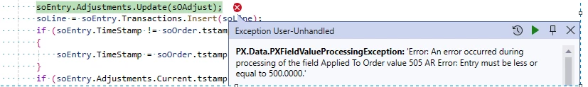 FunctionA's logic involves adding a SOLine to the current SOOrder. I also need to modify the Applied To Order and Payment Amount fields under the Payments tab to match the added SOLine. How can I resolve this error?