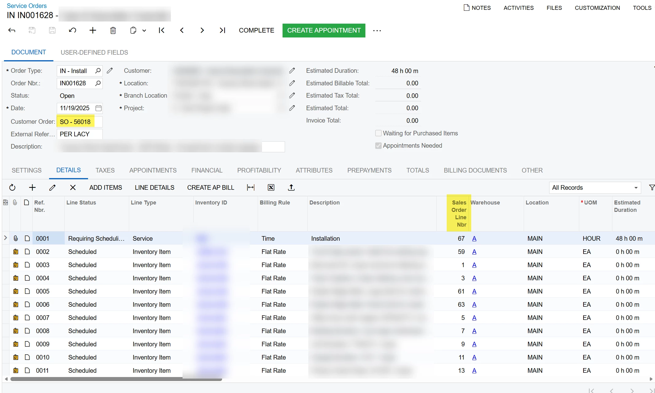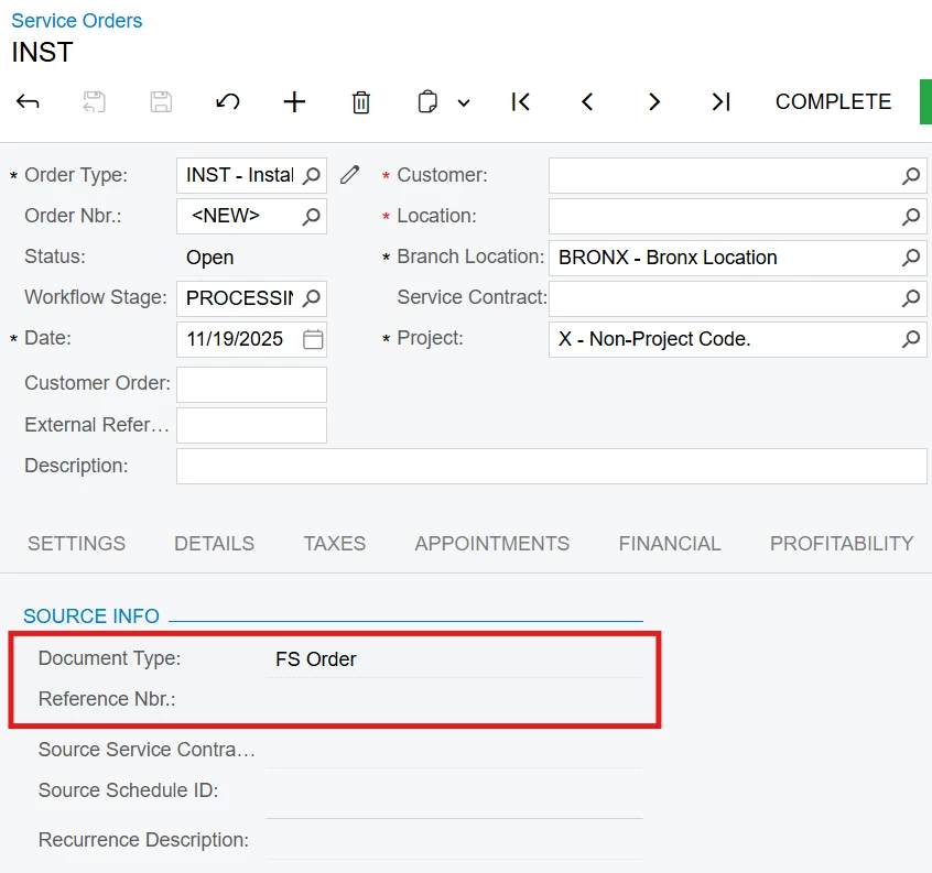 Another approach it to create a Service Order starting on the Service Order screen, but in this case there doesn’t seem to be any option in the User Interface to identify the source of the service order, which needs to be linked back to the Sales Order. Even on a new Service Order, these fields are not editable. The only way that I can find to create the linkage is using the ‘Create Service Order’ action from the Sales Order.