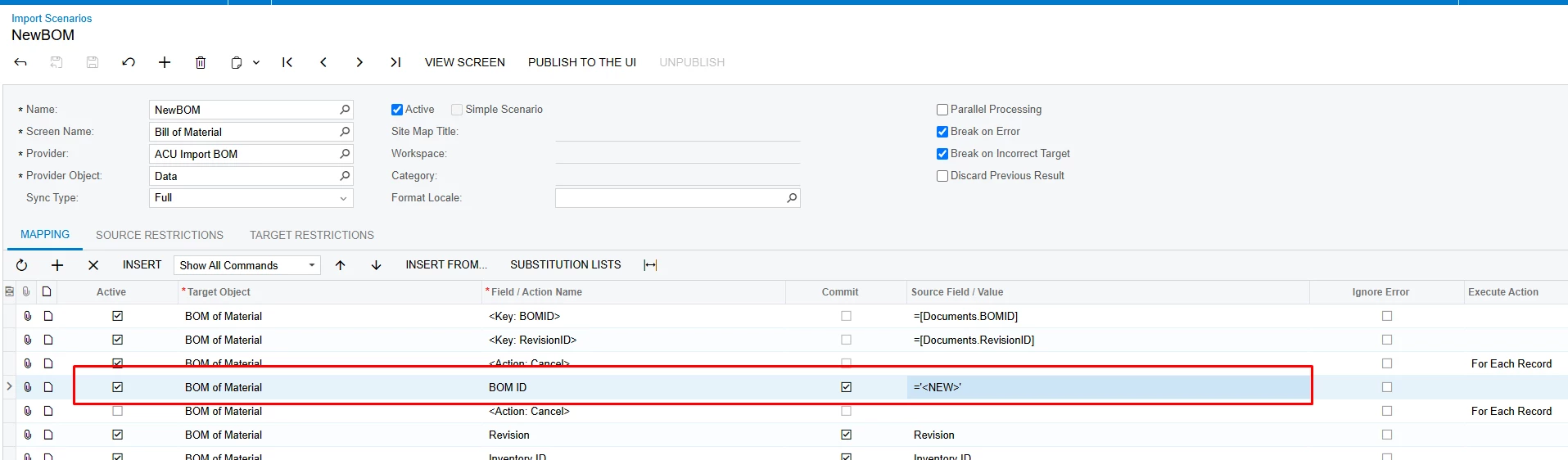 H, working on importing some BOM’s into the Bill of Material screen. I believe I have the hard part working, it’s creating the BOM as expected with multiple operations and/or materials listed under the operations. My issue is with the BOM ID field. I want the system to auto-generate the BOM ID field. The AMBOM numbering sequence is NOT set to manual. If I hand enter a BOM and hit Save, it creates the BOM ID using the numbering sequence BUT my import scenario when run, creates the BOM using the BOM ID from my spreadsheet. From previous experience in other screens, I’ve seen the value in the spreadsheet, is kind of ignored by Acumatica and it will just generate the next number from the sequence for example when importing AP Bills and I want to use the auto seq for the reference number.