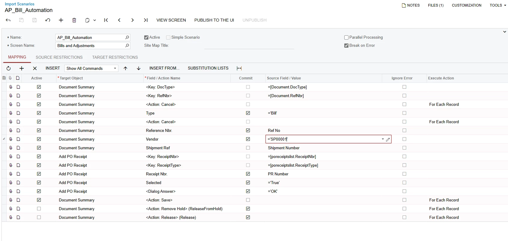 We are trying to create bulk AP bills in the system by using an import scenario, wherein the bill needs to be created and the detail from the PR needs to be fetched into the bill as well and the bill will be created in the on-hold status.