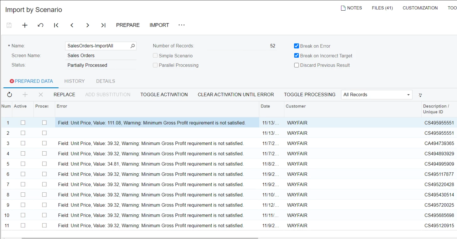 I am trying to bulk import sales orders and got this error so it did not push to process. But when I manually created a sales order, it is just a warning but I can still save the order.