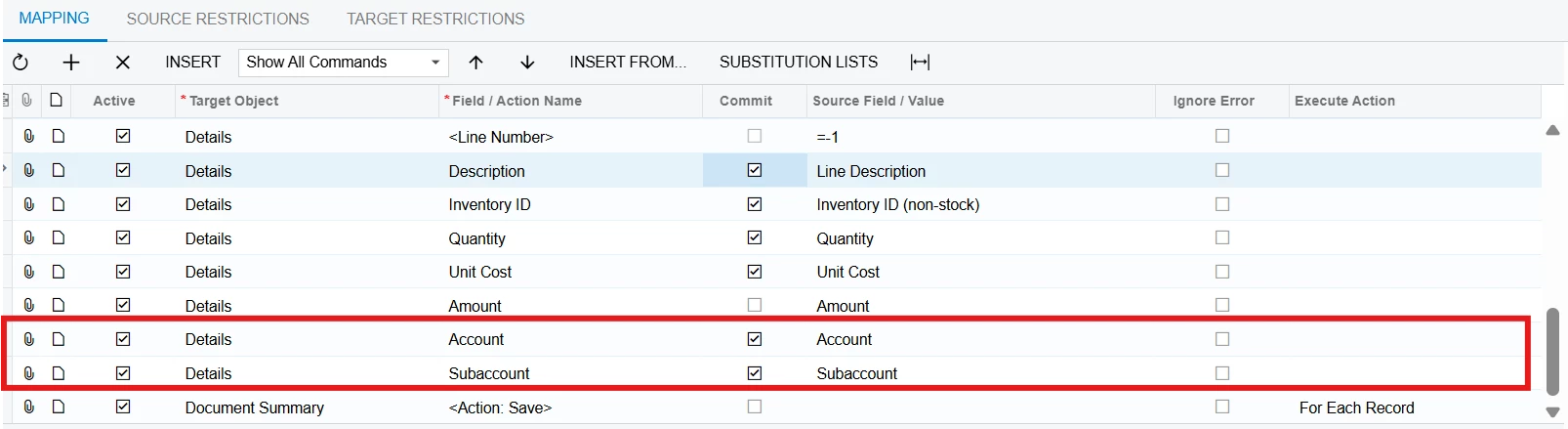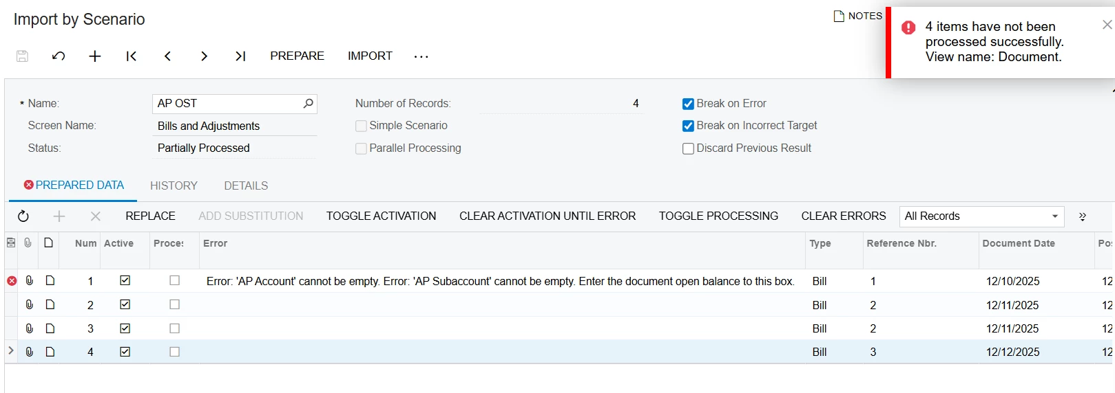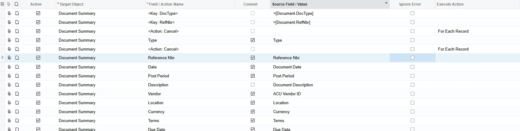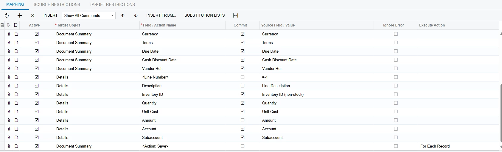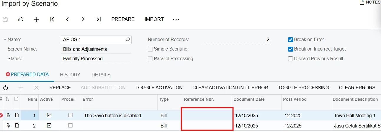 Hi, i want to import an AP Bill in Acumatica use Import Scenario but when i try to import there is an error “The Save Button is disabled” i already looked up my mapping and following the same field order as the screen but i still don’t get it. Please take a look of my mapping bellow: