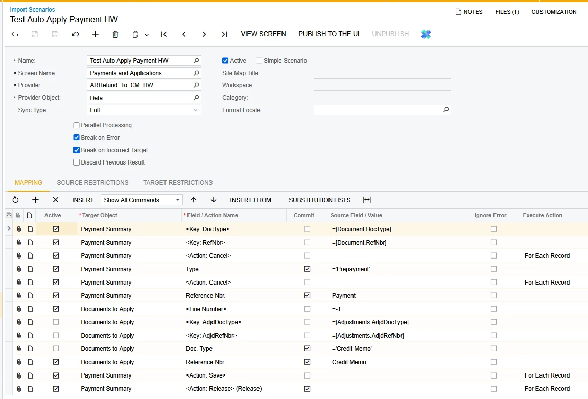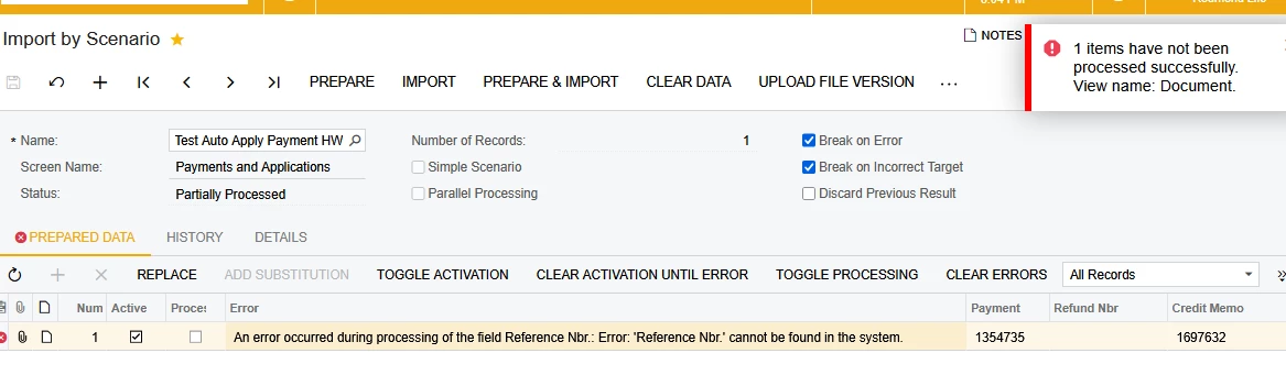 I’m trying to import credit memos to apply to prepayments and have created an import scenario but it doesn’t seem to work. I’ve search on the forum to try various solutions but I can’t seem to get this to work. Here is my import scenario and the error I’m receiving.