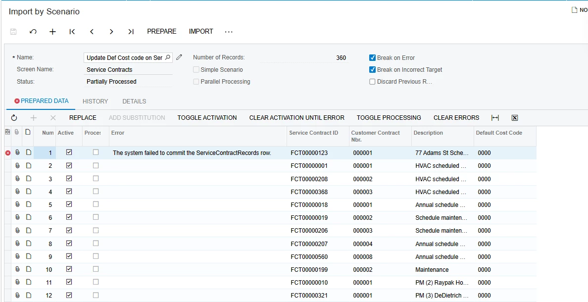 I keep getting the error message of “The System failed to commit the ServiceContractRecords Row when running an import scenario” I tried unchecking the commit box as another post suggested but I am still getting the same error message.