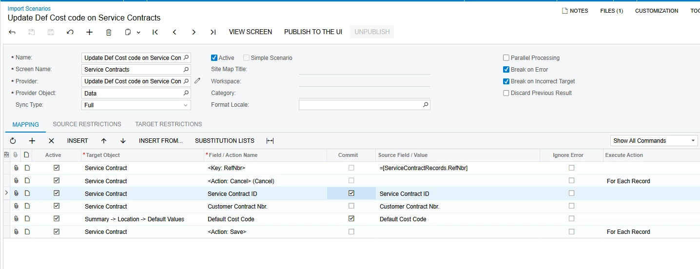 On some of the service contracts the Default cost Code field was left empty. This is preventing our Service dept from Processing the service contracts and move them to the expired status. I what I thought was a simple import scenario to update the blank ones to add the default cost code to those missing.