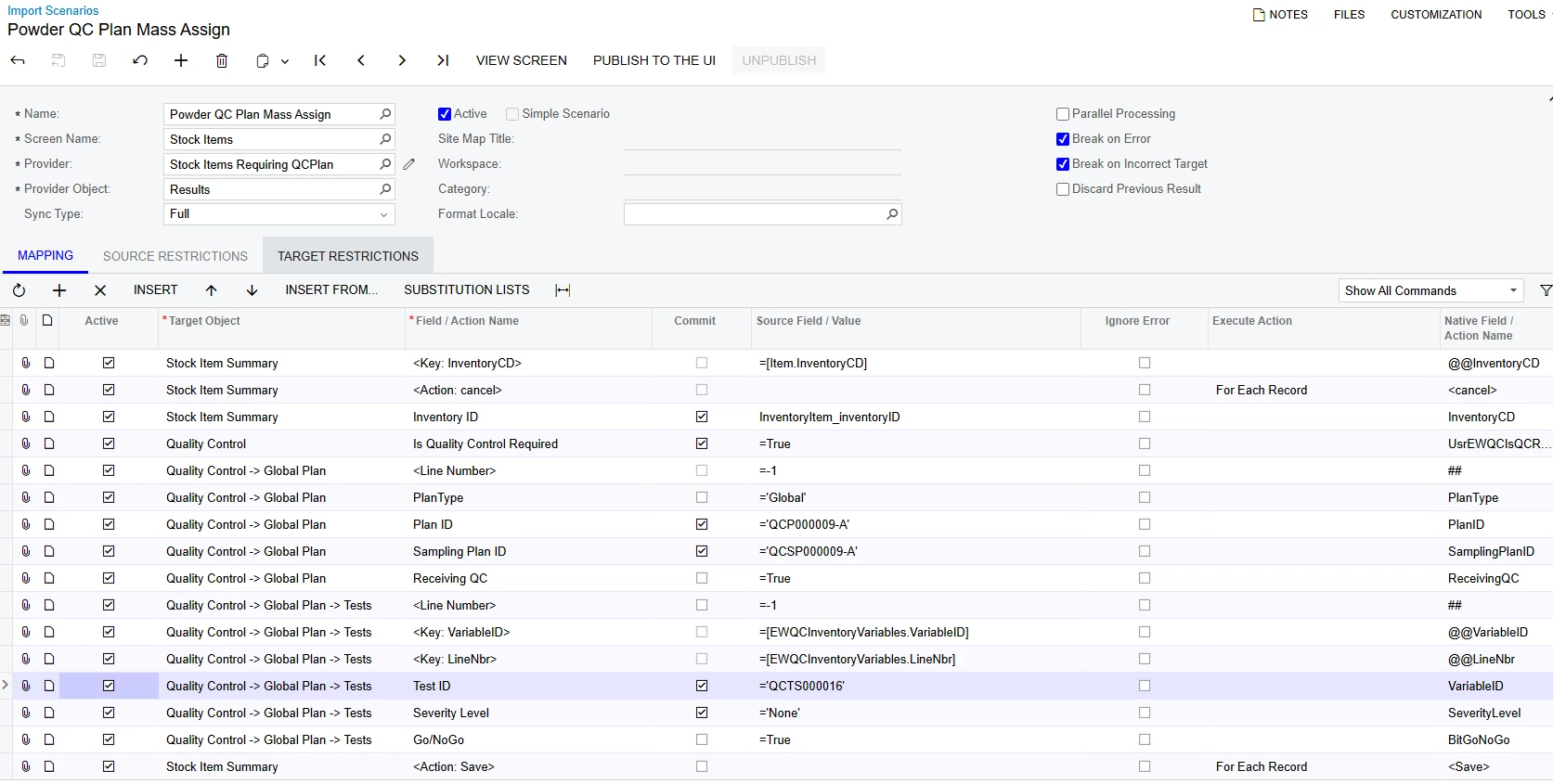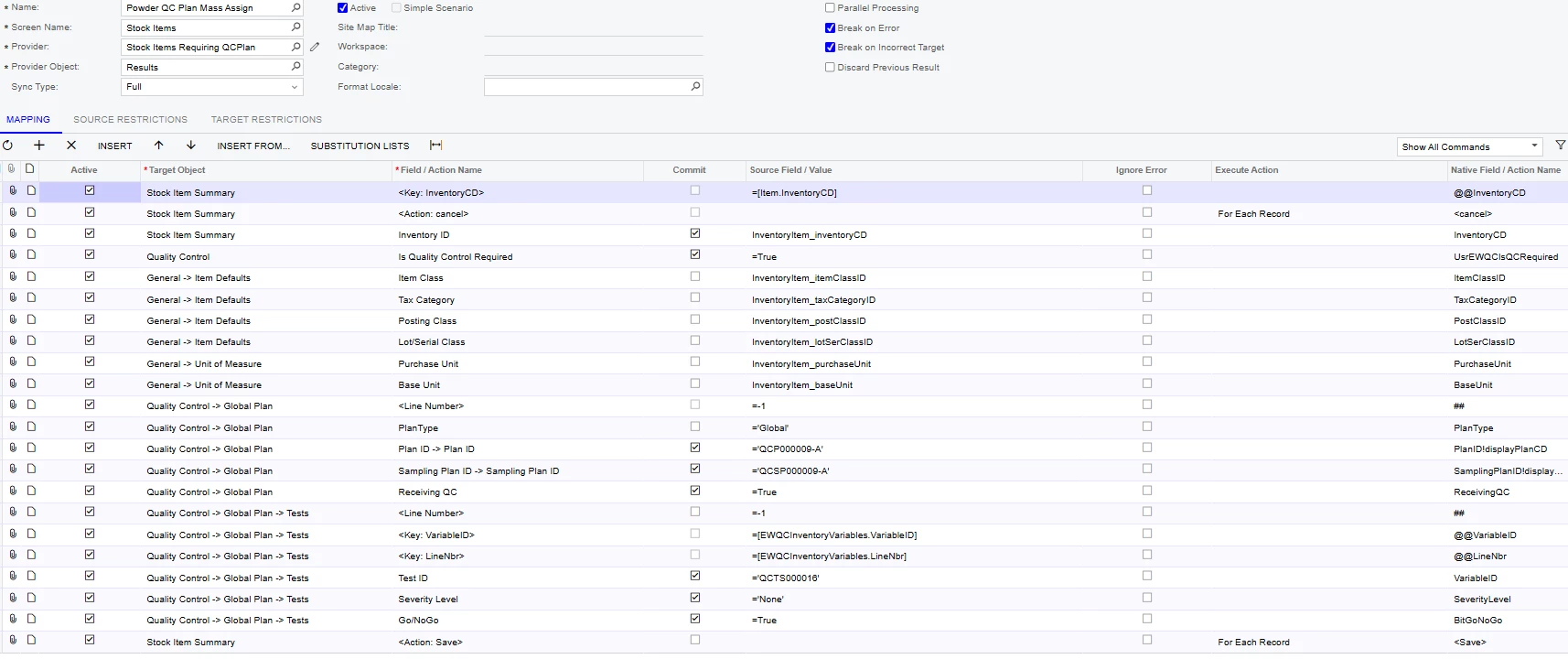This might be a long shot, but I am trying to create an Import Scenario to mass update stock items with Quality Control Plans. Which is part of the QMS Module.