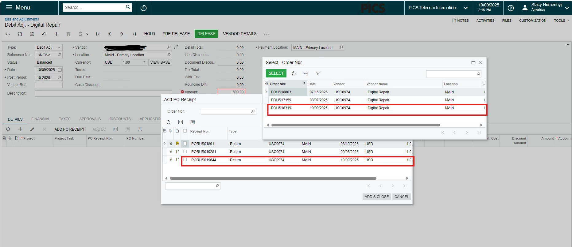 As well as the vendor, I have the PO number & PO Receipt Line number.