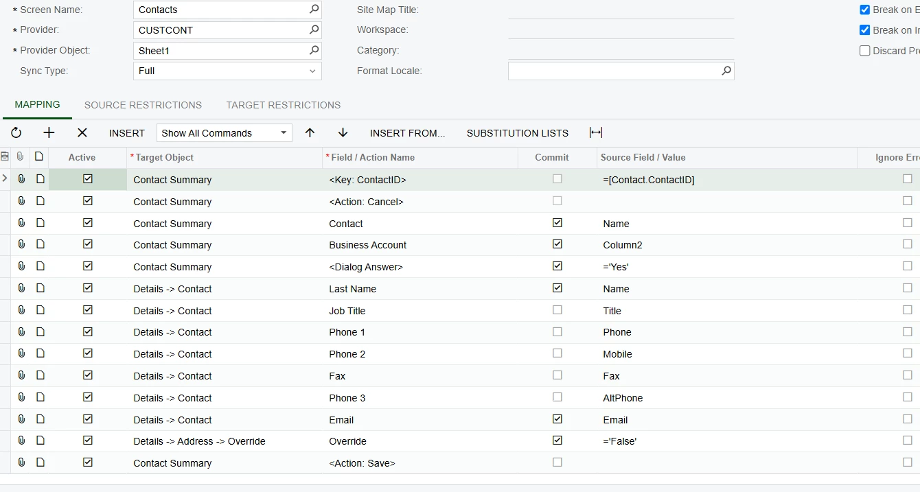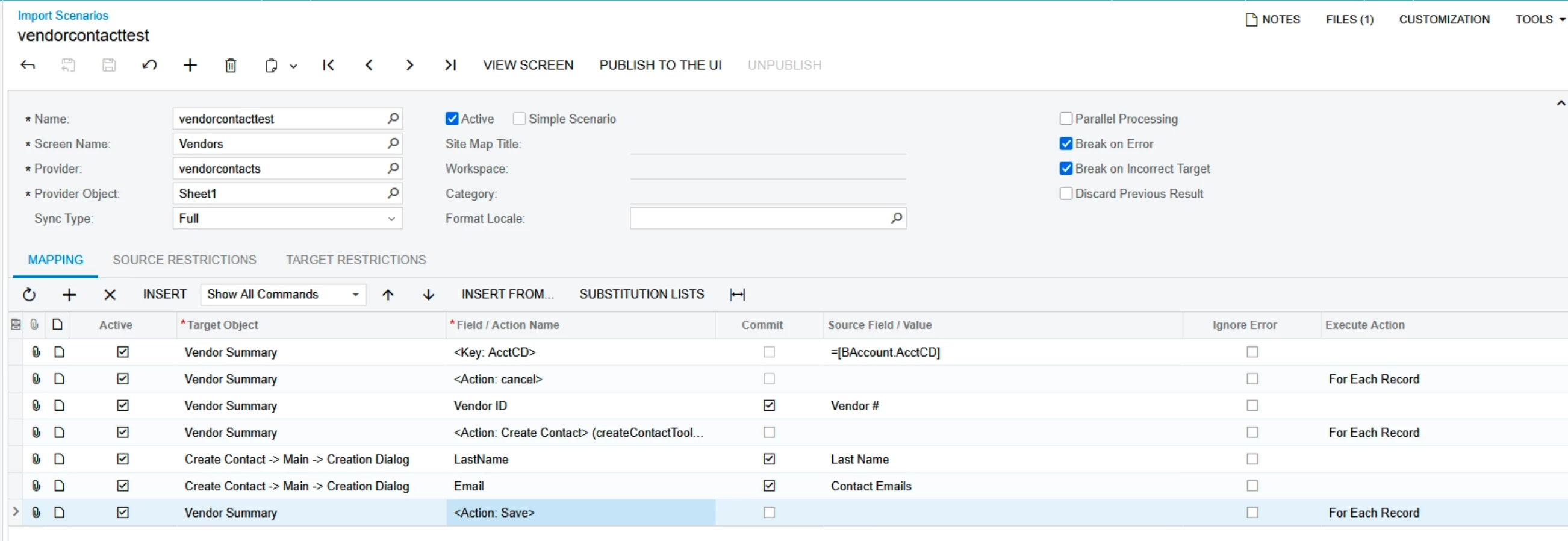 I’m working on an Import Scenario that would import vendor contacts and set the different lien waiver contacts in mailing and printing. I haven’t made it to the recipients part yet because I’m stuck on adding a new contact. I’ve prepped the import scenario below and it comes back with the error “Last name cannot be empty. I cannot tell if the scenario isn’t inputting the data or if it isn’t saving correctly. Could anyone please tell me what I’m missing here? Thank you!