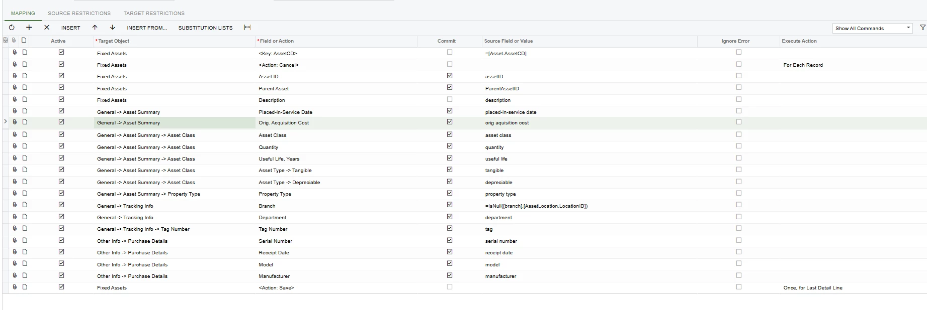 Below is the import scenario I am trying to use to get our fixed assets into Acumatica. When I run the import by scenario, it shows that the records processed, but nothing appears in the fixed assets form.