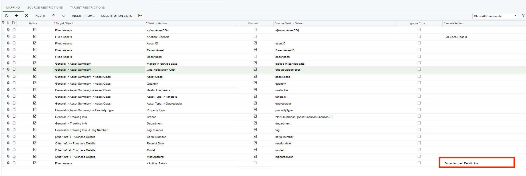 Below is the import scenario I am trying to use to get our fixed assets into Acumatica. When I run the import by scenario, it shows that the records processed, but nothing appears in the fixed assets form.