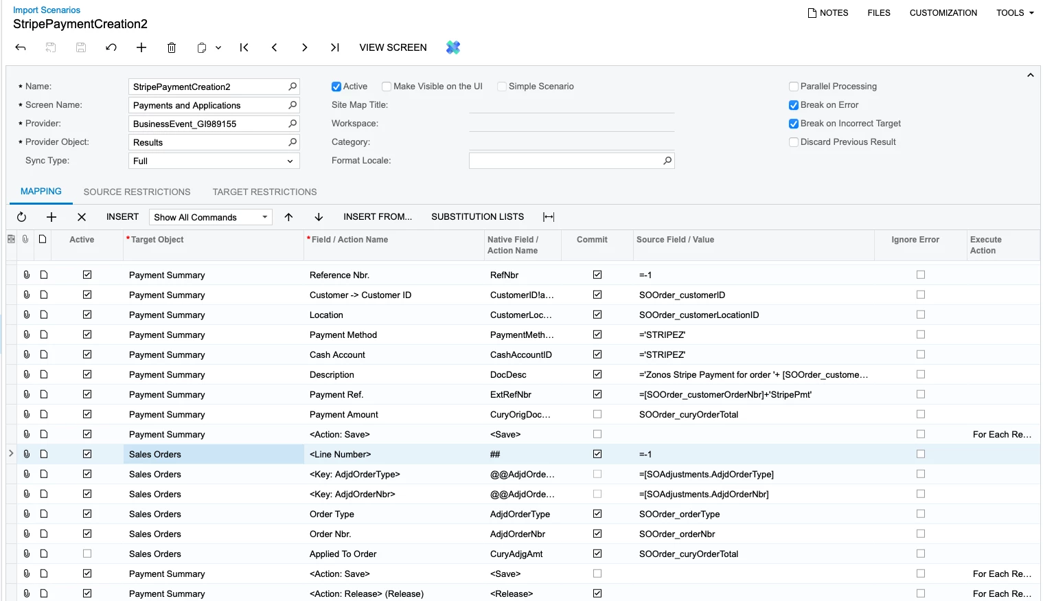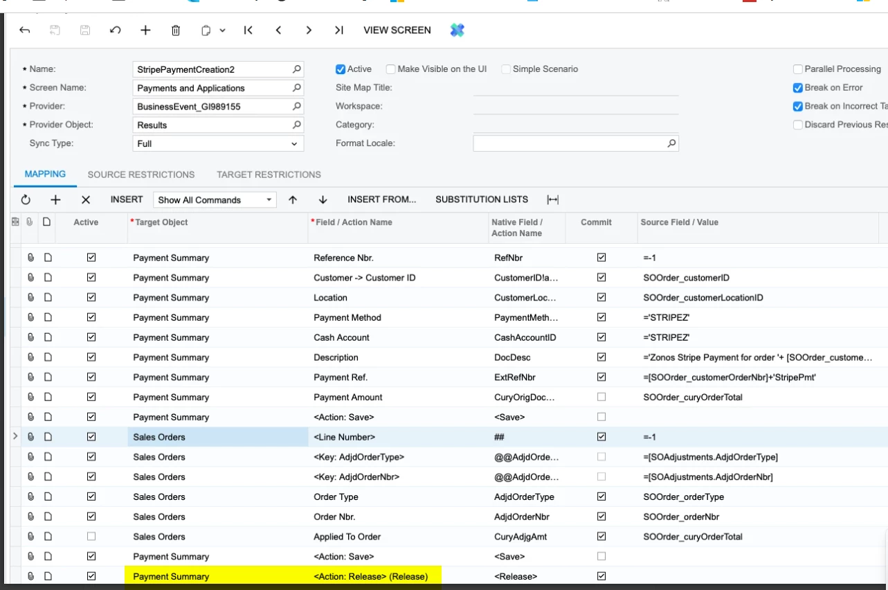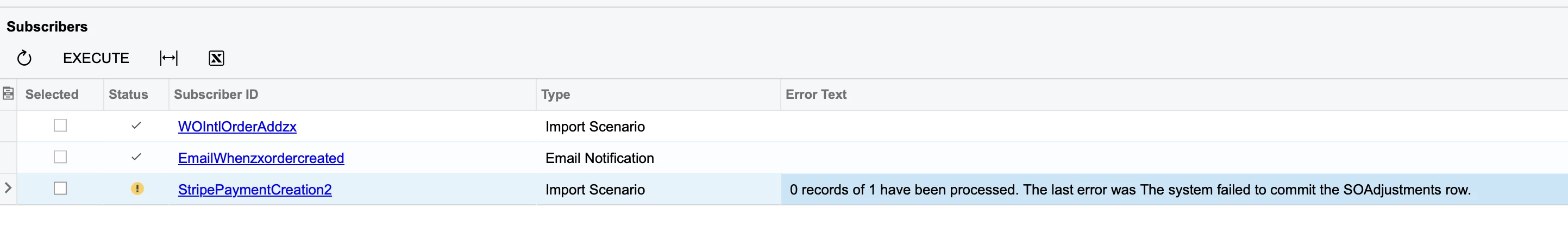 This issue is similar to this question. I have a business event which is triggered for certain types of orders. When triggered, one subscriber takes the sales order data and does an import scenario to add a prepayment and assign it to the sales order. I can get the prepayment created, but when adding the Sales Order to the prepayment I am getting an error “The system failed to commit the SOAdjustments row.” I know I am close on this - just needs a fresh eye and a tweak and I bet it will be there. Any thoughts?