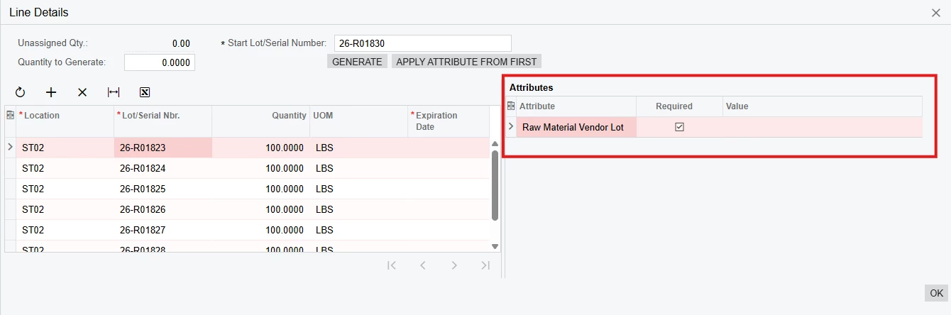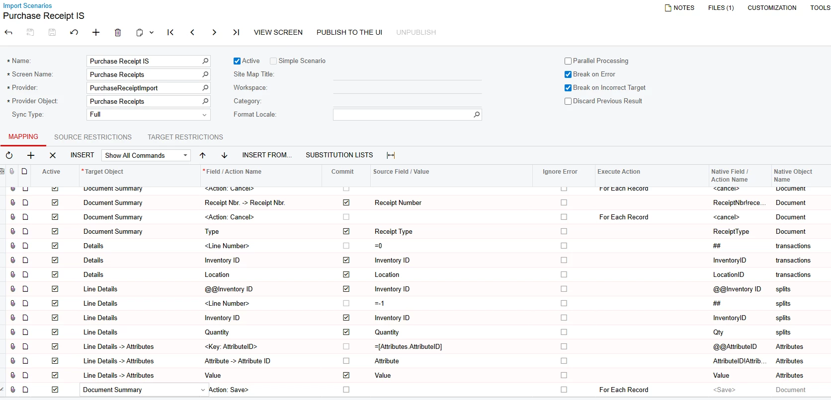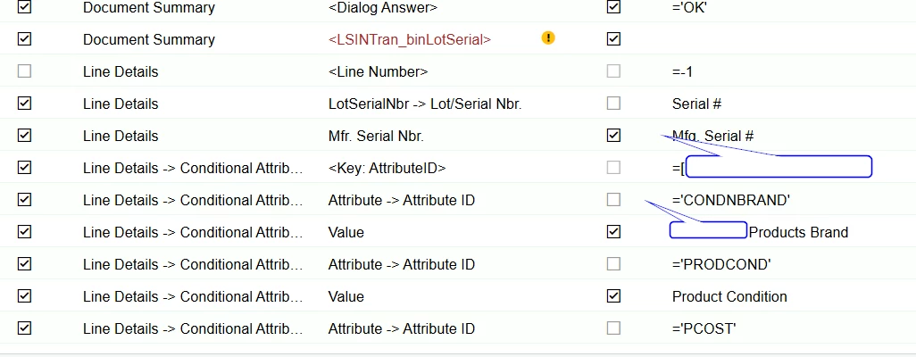 I am attempting to create an import scenario that populates attributes at the line level for purchase receipts. My import scenario is adding the correct inventory id, quantity, etc. but doesn’t populate the attribute value. What am I missing?