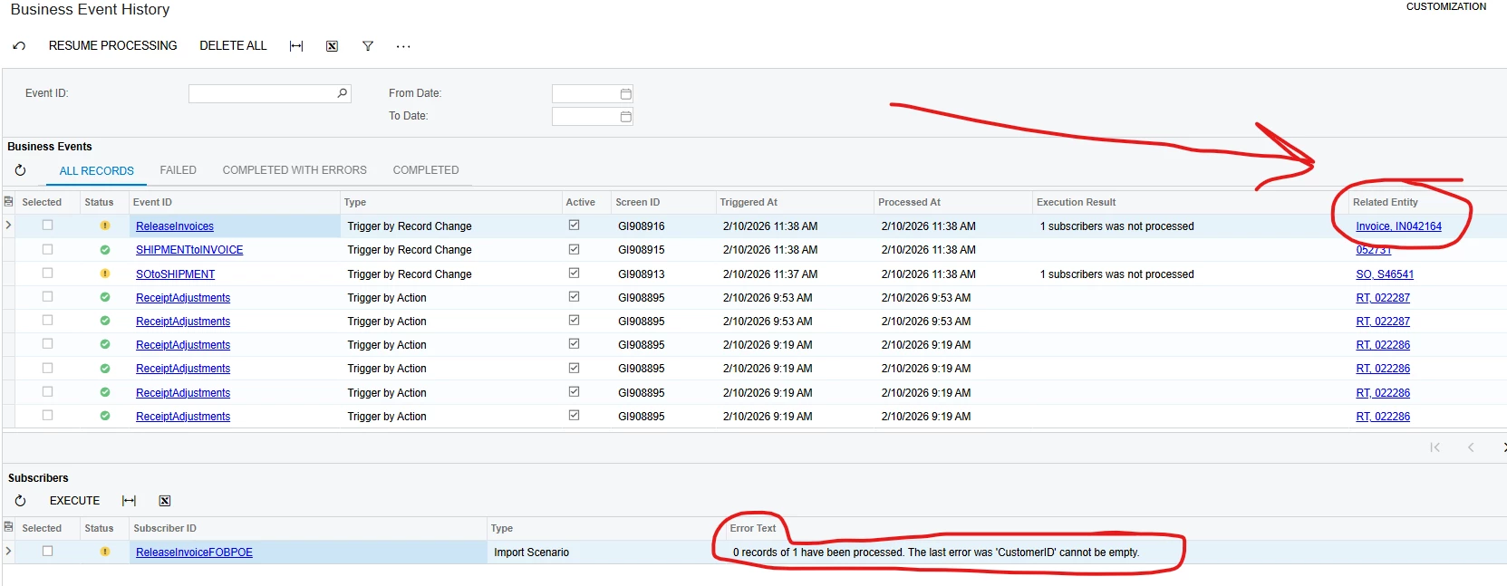 My business event history says: 0 records of 1 have been processed. The last error was 'CustomerID' cannot be empty.