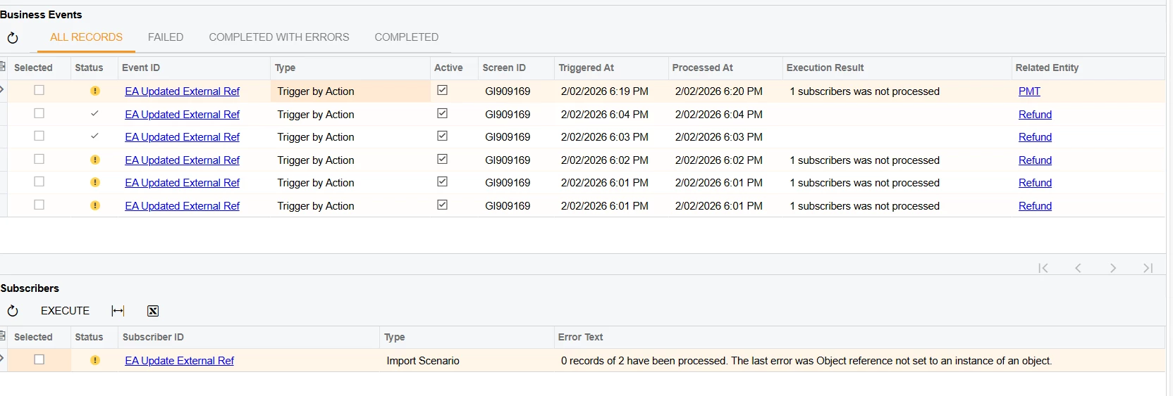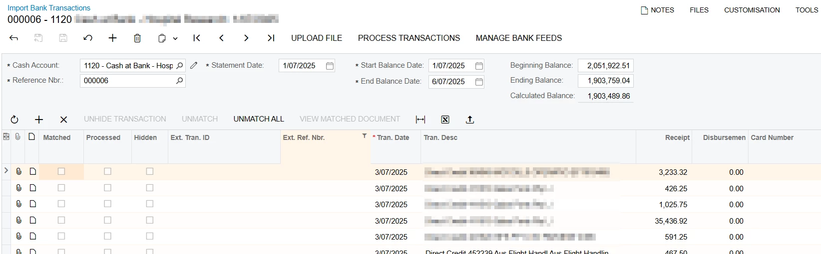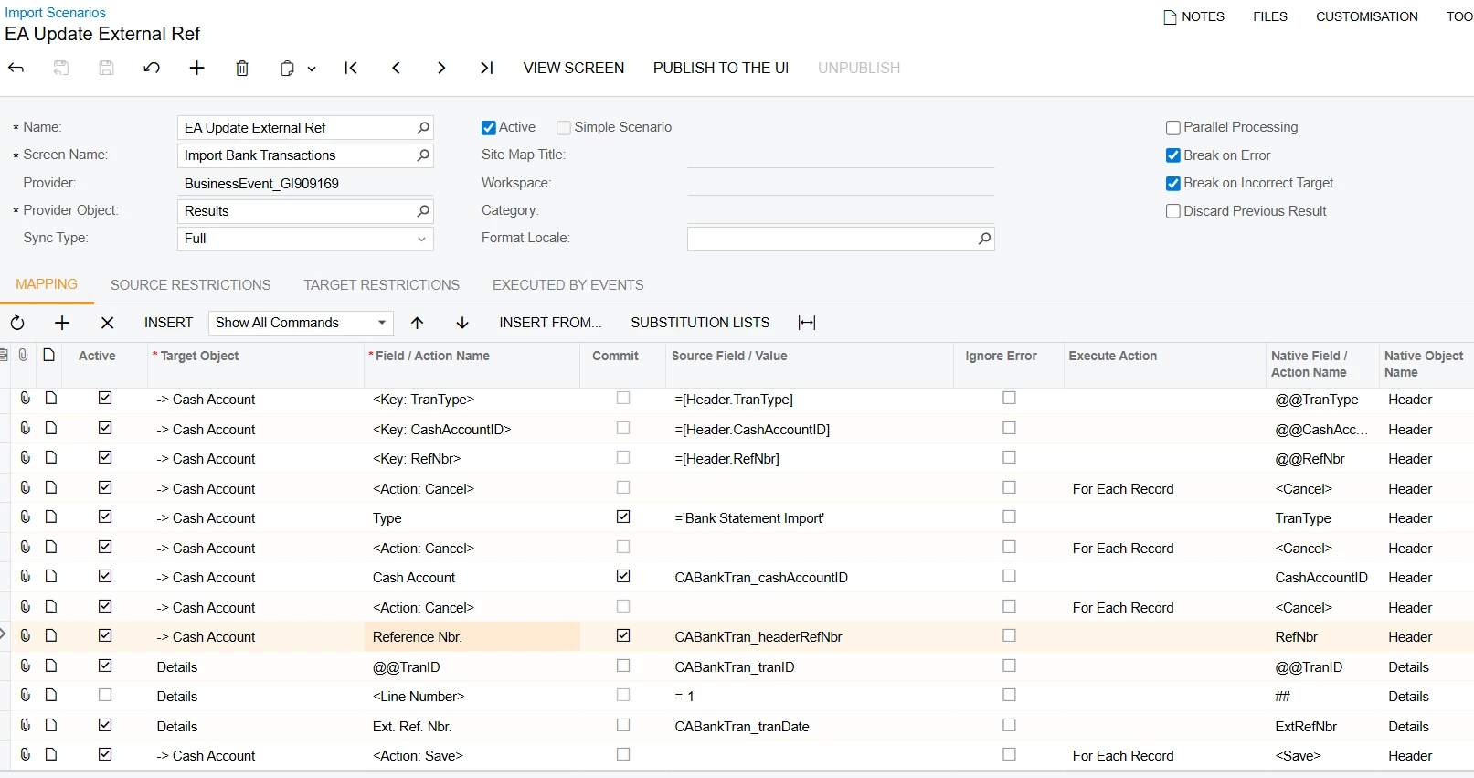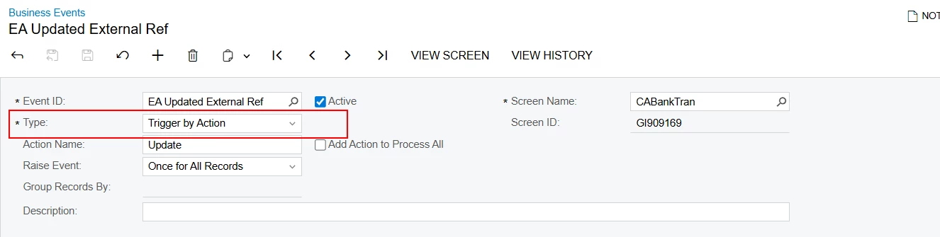 I am creating a Business Event to update the External Ref Number field on the “Import Bank Transactions” form.