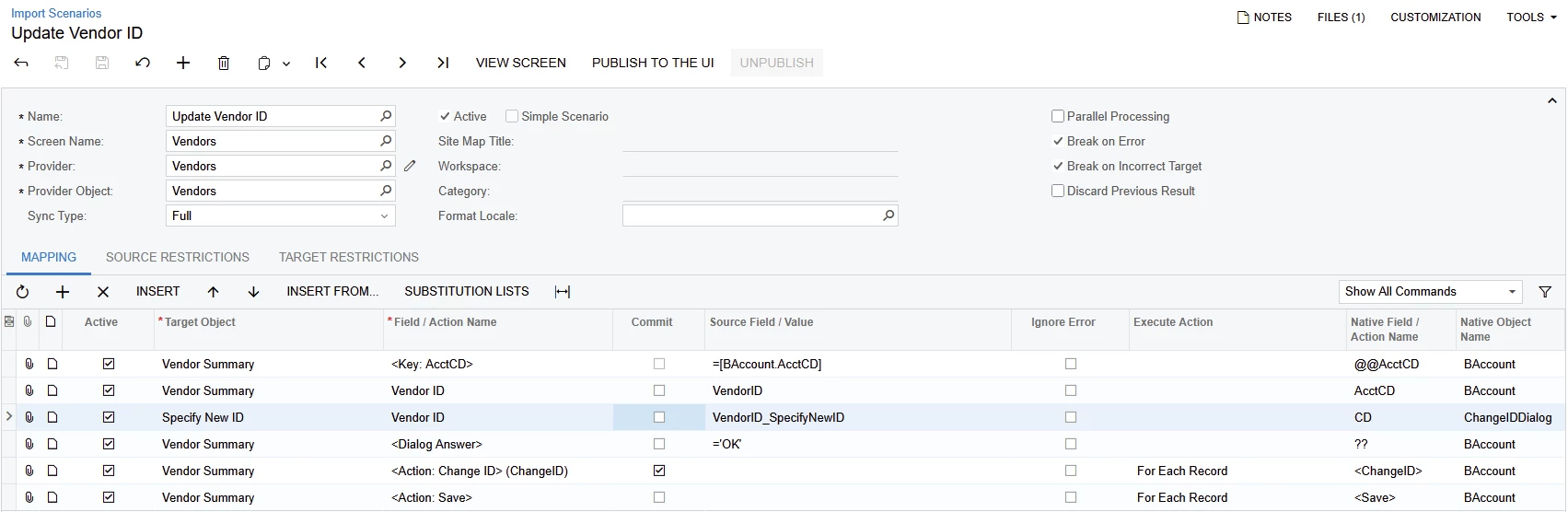 I’m trying to update multiple Vendor IDs in Acumatica 25R1 using an Import Scenario. The Import Scenario itself runs fine when tested manually, but I cannot get it to work in bulk. My main challenge is that the Generic Inquiry I created is not showing up as a source in the Import Scenario. Since the Vendor screen works off the Vendor DAC, I expected the GI to be selectable, but it remains unavailable. I also noticed that Import Scenario as a subscriber in Business Events is disabled for the Vendor screen. Has anyone found a working method to bulk update Vendor IDs or use a GI as a data source for this in 25R1?