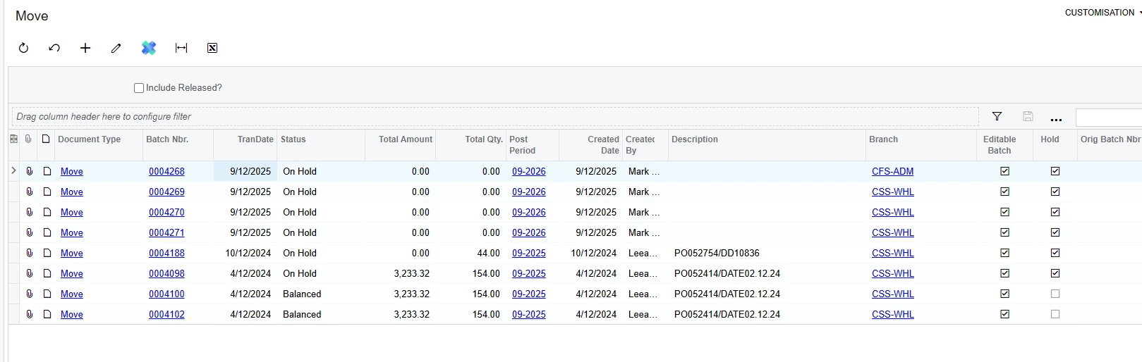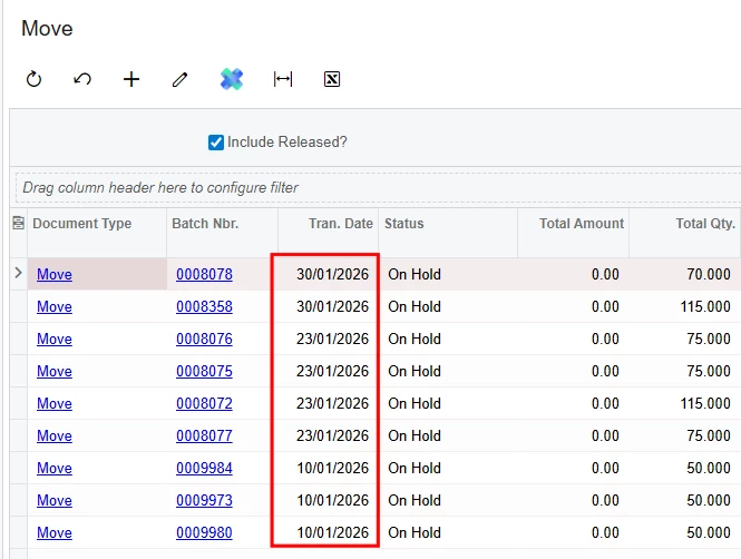 The goal is to update all Open (Hold/Balanced) Move Transaction dates to the first day of following month. So, if I have Move Transactions dated Dec 2, Dec 4 and Dec 5, the GI aims to update them to Jan 1, 2026. Once the import works, I will set an automation schedule to run it every end of month during their month end closing.