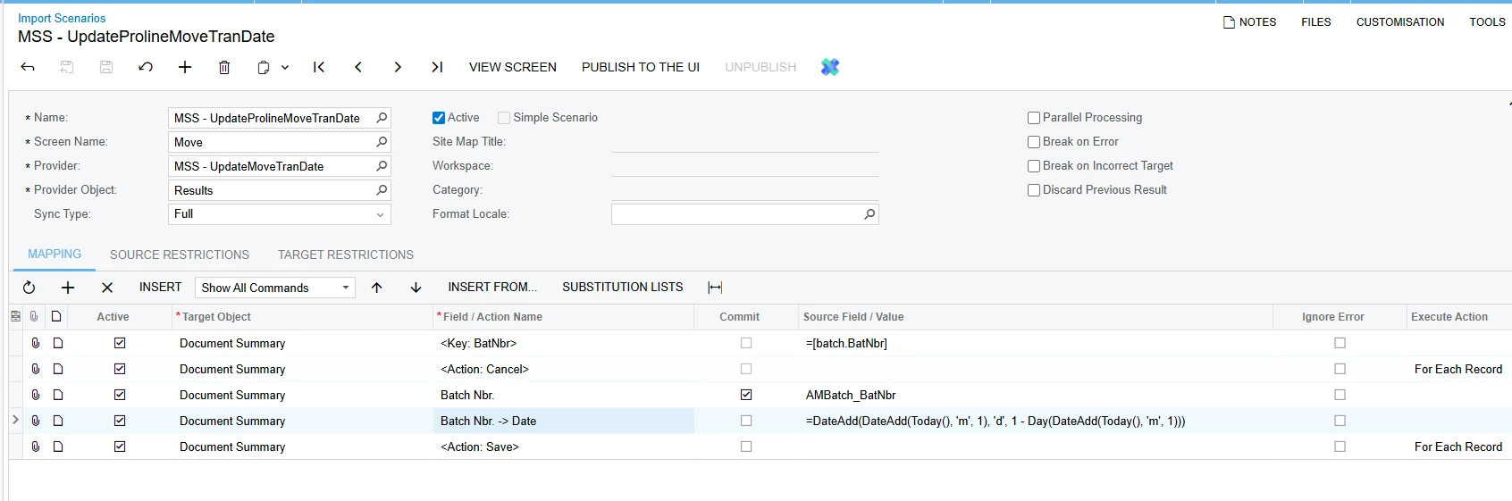 Hi gurus. How do I create an Import Scenario that changes the transaction dates of Open Move Transactions dated in the current month to update to the first day of next month?