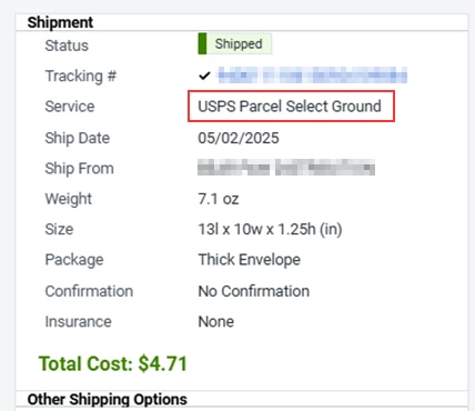 In ShipStation, the ‘USPS Parcel Select Ground’ option has been selected: