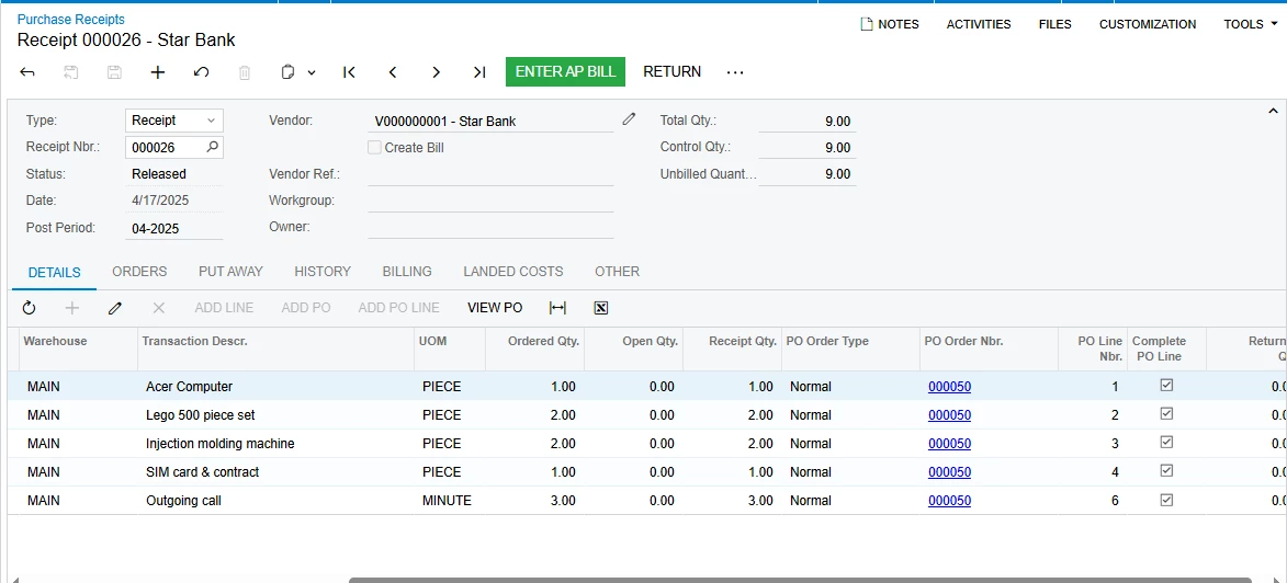 { "POReceiptNbr": { "value": "000026" }, "POReceiptLine": { "value": 6 }, "POReceiptType": { "value": "Receipt" } },
