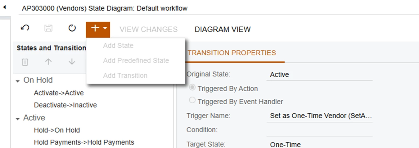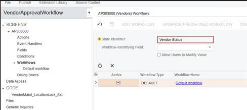 In our current version of Jamis Prime, the workflow on the Vendors screen (AP303000) is read only. I would like to create a custom workflow for vendor approvals. Is there a configuration I can select that would allow for me to extend the workflow to include our requirements?