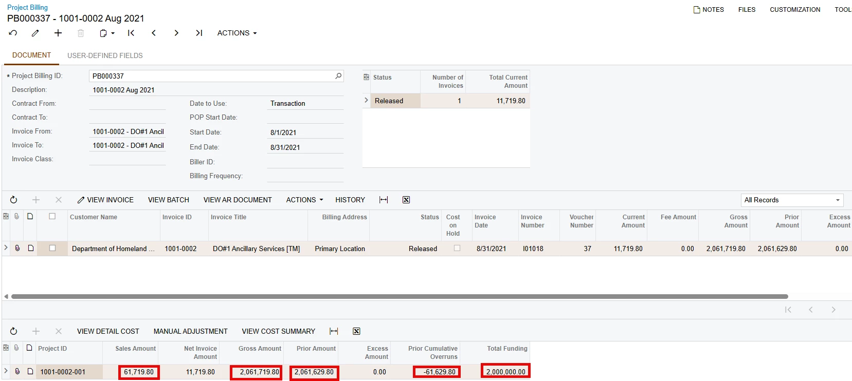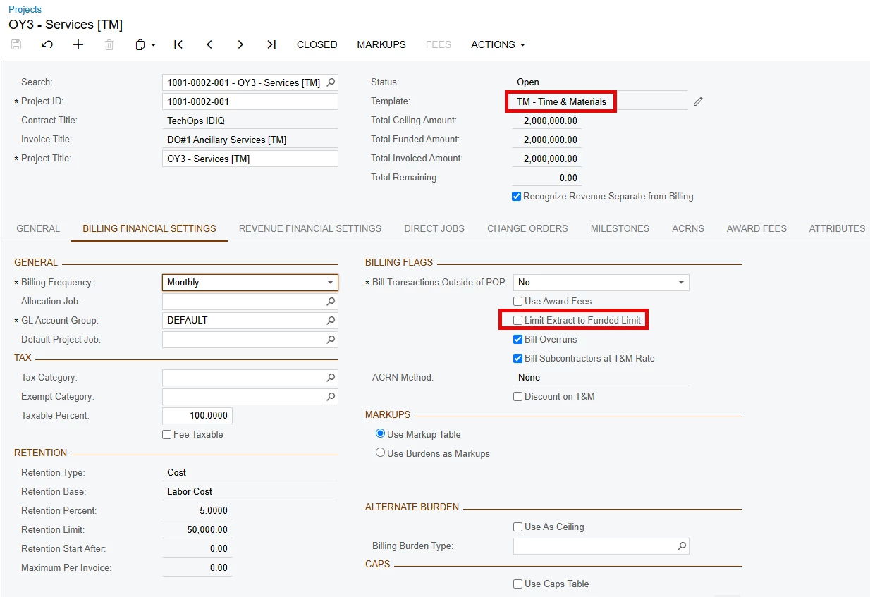 In the example below, the Project is a T&M and the Bill for Overruns is checked. This means it ignores funding and bills everything. If not checked, it will only bill within funding.