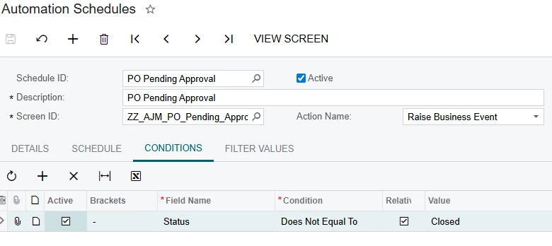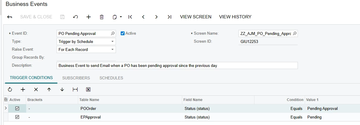 To sum up the lengthy tutorial, a generic inquiry is created to show any Purchase order that has been pending approval since the previous day. The Business Event schedule triggers during business days to send out notifications to the approvers and their supervisors reminding them to do the approval.